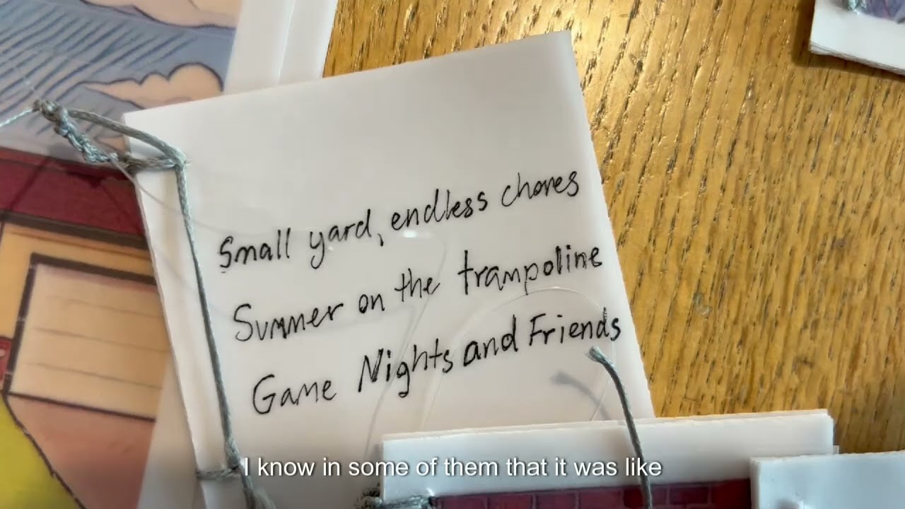 Three strands of fishing line suspend a series of handmade mini‑books. The covers feature eight illustrations of the houses I lived in, and eight poems recalling childhood memories from each of those places, distributed across the lines. Every book is constructed from vellum pages and bound with waxed string using simple stab binding. The combination of the specialty covers and poems in addition to a few blank books creates a layered record of home and childhood memory.